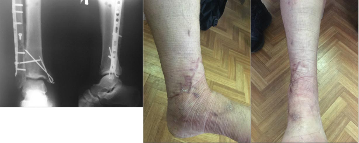 Открытый переломовывих голеностопного сустава (открытый оскольчатый перелом медиальной лодыжки, оскольчатый перелом н/3 малоберцевой кости с разрывом дистального межберцевого синдесмоза и вывихом стопы кнаружи, обширная рвано-ссадненная рана медиальной поверхности голеностопного сустава, Густилло 3) - в результате ДТП, нога попала под колесо топливозаправщика. Доброго дня! Коллеги, какую бы тактику лечения вы бы выбрали у такого пациента? В ургентном порядке ПХО, МОС медиальной лодыжки спицами, ЧКО АВФ стержневого типа. На 5 день в связи с лимфореей на стержнях в костях стопы демонтаж аппарата и ORIF малоберцевой кости пластиной (рискованно, понимаю). Рана в области остеосинтеза зажила первично, в зоне первичной раны -с участками сухого некроза.