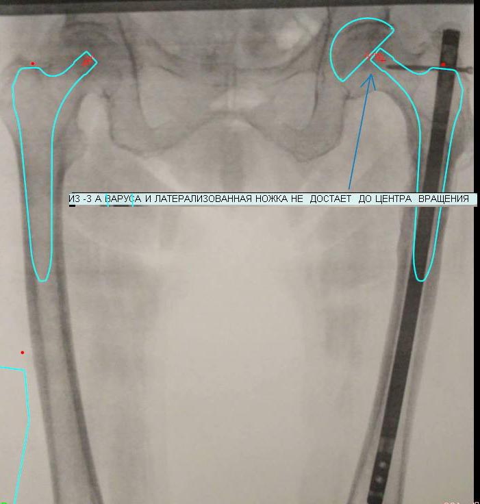 По моему мнению, здесь, если рассматривать эндопротезирование тазобедренного сустава, то при такой варусной деформации проксимального отдела бедра, очень трудно будет расположить бедренный компонент, не повредив большой вертел при устранении имеющегося варуса или другой вариант - ножка встанет так, сохранив б.вертел и сохранив варус. Или я ошибаюсь?