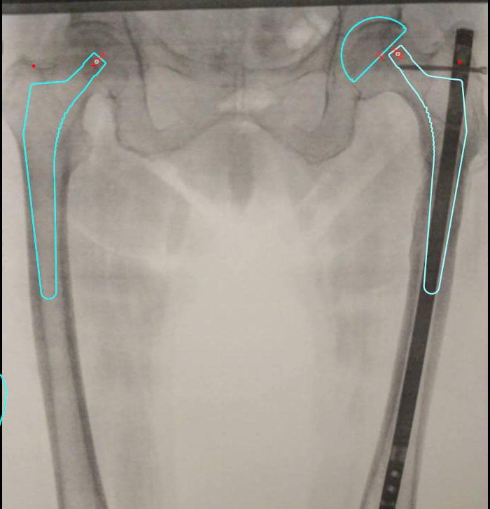 Вот такие трудности возникают при первичном эндопротезировании тазобедренного сустава из за нерешенности изначально проблемы, возникшей при переломе - не устранение смещения отломков. Я сталкивался с этим, и имел неудовлетворенность полученным послеоперационным результатом - чтобы выровнять бедренный компонент, приходится очень много убирать кость со стороны большого вертела и рискуя вызвать отрыв мышц, крепящихся к нему.