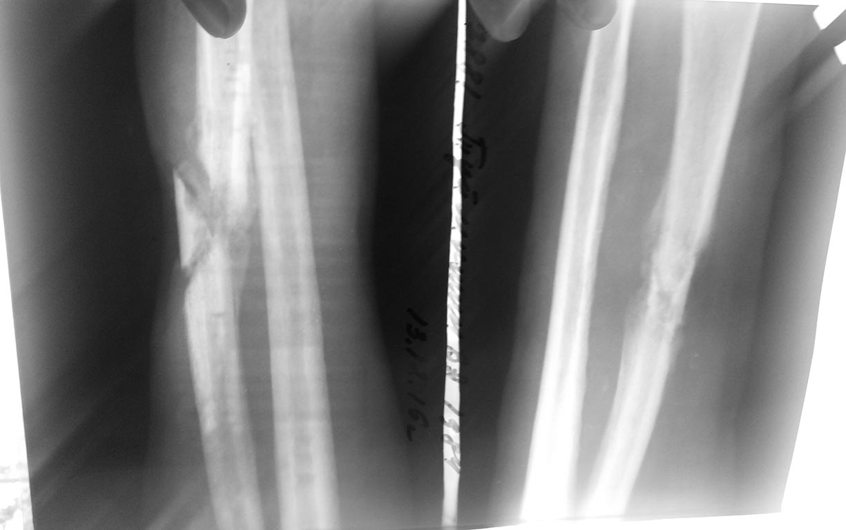 Добрый день, коллеги Больной 1984 г.р. 6 месяцев назад получил травму - удар высоковольтным током. Тактика лечения? Резицировать концы отломков далее АВФ? < | >