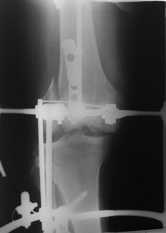 Уважаемый коллега, информации и в самом деле мало. Желательно, конечно, увидеть внешний вид конечности и R-граммы в двух проекциях до и после операции. Тут наверняка имеются серьезные повреждения связочного аппарата. Для уточнения можно снять аппарат, наложить гипс и сделать МРТ. А если повреждение костных структур выражается только тем, что мы видим на этом единственном снимке, то оптимальным вариантом кажется синтез наружного мыщелка опорной пластиной. Эндопротезирование здесь может подождать. И при остеосинтезе иметь в виду, что наверняка придется делать пластику крестообразных связок.