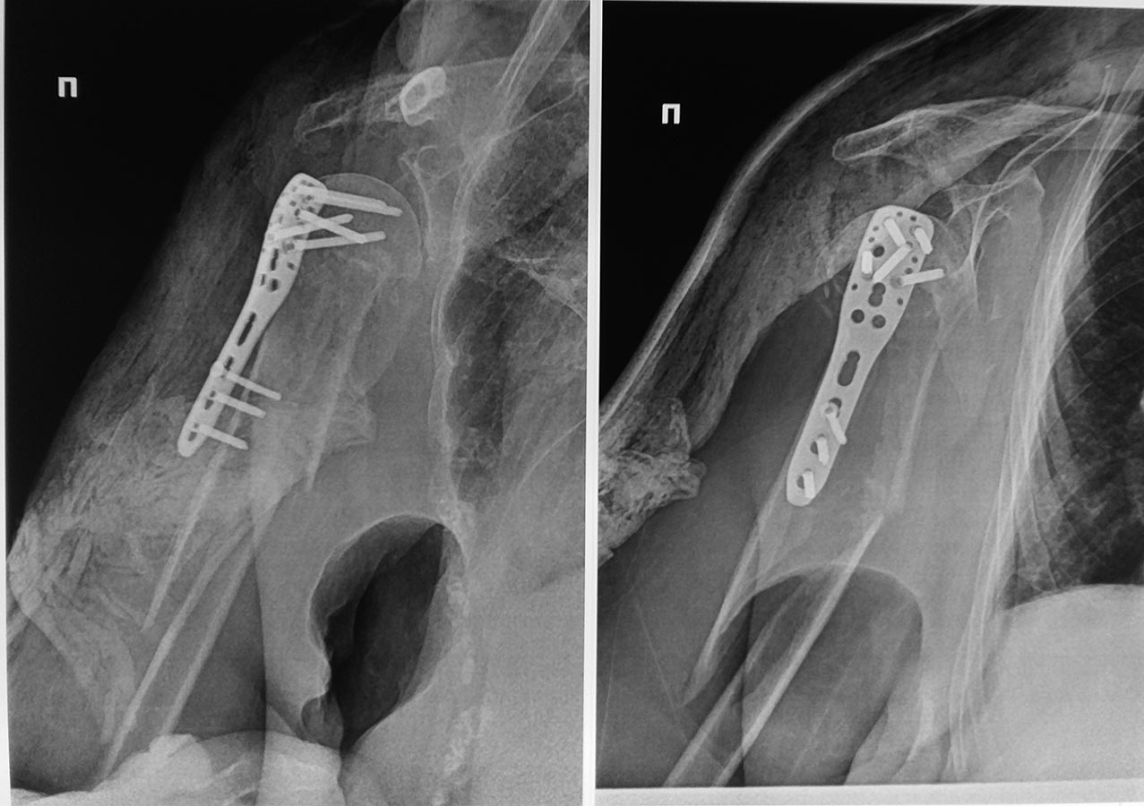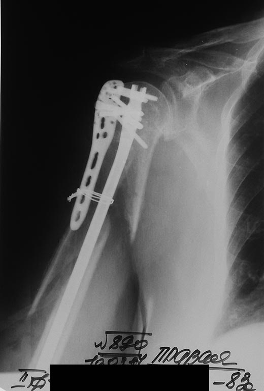 Судя по снимку, пластина держится за головку плечевой кости. Винты в хвосте пластины висят в воздухе, так как линия перелома прошла через них. На послеоперационных рентгенограммах хвост так же отстоит?