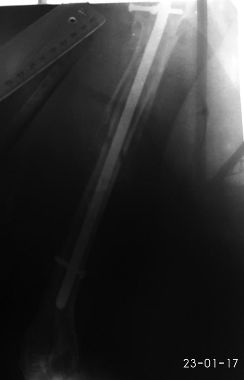 пациентка соматически компенсирована. Первичная послеоперационная рана зажила первичным натяжением, швы сняты. Психоневрологический статус без особенностей. Рассматриваю вариант стержнем без удаления конструкции и попытаться заблокировать стержень проксимально через одно из отверстий в пластине.Имел ли кто нибудь опыт лечения таких переломов и результаты?