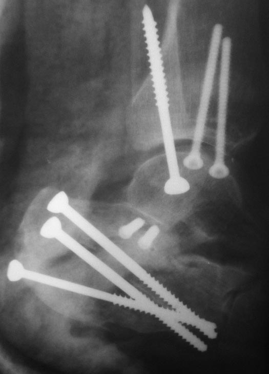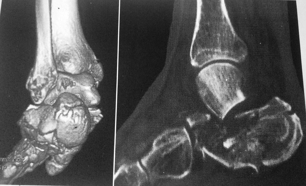 2) Технически попроще - монтаж аппарата Голень стопа с дистальной тракцией бугра пяточно кости. Восстановит только угол Белера. Суставную поверхность не восстановит. Потом скорее всего потребуется подтаранный артродез.