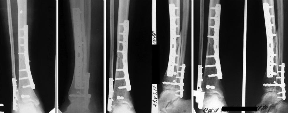 Травма бытовая 12.12.2016, 20.12.2016 выполнена открытая репозиция остеосинтез большеберцовой кости пластиной, заднего края ДМЭ винтом, синтез наружной лодыжки пластиной. Рентгенограмм до операции нет. До прошлой недели ходила на костылях без нагрузки, принимала остеогенон. В январе курс реабилитации. В настоящий момент клинически - отека нет, п/о рубец без патологии, пальпация голени безболезненна. Движения в коленном суставе в полном объеме, небольшое ограничение тыльной флексии в голеностопном суставе. Разрешена нагрузка 20-25 кг (до 50% массы тела), 3 дня в таком режиме - новых жалоб не появилось. Мнения по дальнейшему ведению разделились.