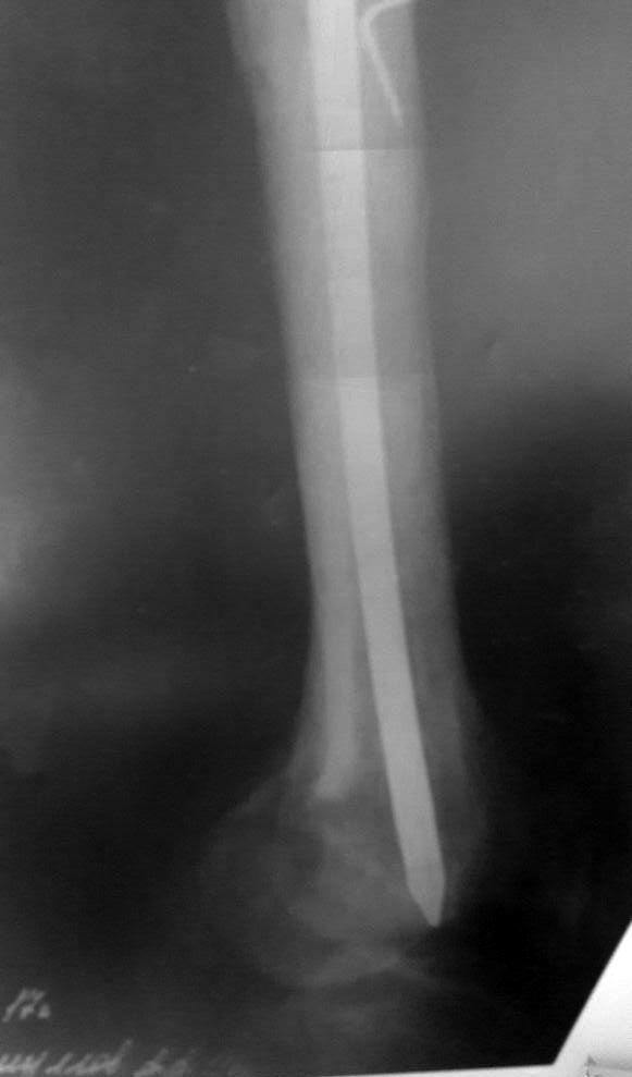 Скорее всего стержень подвижен в канале,т.к. слишком глубоко смещен дистально-пробовать удалять ретроградно со стороны полости коленного сустава с помощью длинного(440-460мм)стержня(лучше-цельного),если не будет продвижения-вскрыть полость стержня сверлом (стенка стержня тонкая),чтобы снять напряжение на костные стенки