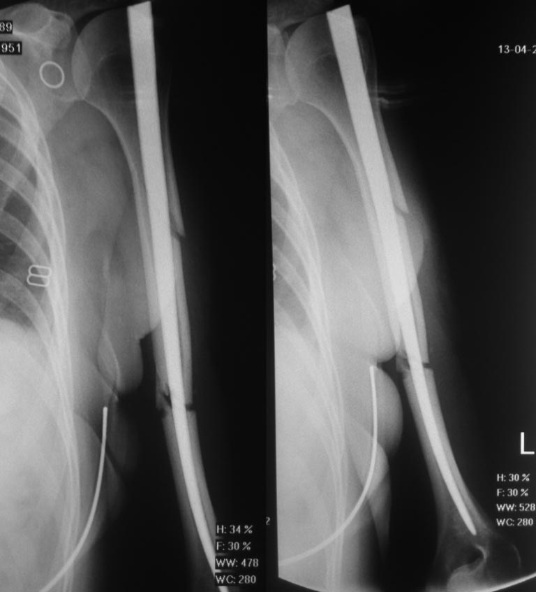 Уважаемые коллеги, в последнее время участились случаи несращения после интрамедуллярного остеосинтеза, в связи с чем разрешите представить вам очередной случай из практики нашего лечебного учреждения (ЦС ВМП)! И попросить вас о помощи с выбором дальнейшей тактики лечения. На прием обратилась пациентка 1951 г.р.(66 лет), через 1 год и 2 месяца после травмы. Из анамнеза заболевания: травма 23.03.2016 , в результате падения на правый бок, обратилась в ГКБ по месту жительства, где был установлен диагноз: закрытый перелом нижней трети диафиза левой плечевой кости, в связи с чем была госпитализирована и 30.03.2016 выполнена операция: закрытый интрамедуллярный остеосинтез левой плечевой кости титановым плоским стержнем. В послеоперационном периоде беспокоили боли в нижней трети плеча, усиливающиеся при движении в смежных суставах, ограничение отведения и сгибания в левом плечевом суставе. На повторном приеме через 3 месяца установлен диагноз: псевдоартроз нижней трети диафиза левого бедра после остеосинтеза плоским стержнем. В связи с чем была направлена в областную больницу, где 31.08.2016 выполнено удаление плоского стержня и реостеосинтез интрамедуллярным стержнем со статическим блокированием и серкляжем на уровне перелома. В послеоперационном периоде через 5 месяцев поле операции у пациентки появились жалобы на появление деформации в нижней трети диафиза. На повторном приеме в областной больнице рекомендовано исключить физ.нагрузки на левую руку, электрофорез с новокаином. Однако жалобы сохранялись. На повторном приеме через 4 месяца пациентке было рекомендовано обратится в наше отделение. На момент осмотра через 10 месяцев после последней операции, пациентка предъявляет жалобы на боли в нижней трети диафиза левой плечевой кости, наличие видимой деформации и патологической подвижности на этом уровне. Локально: визуально определяется варусная деформация на уровне перелома, определяется укорочение левой плечевой кости относительно здоровой на 3см; пальпация в нижней трети левой плечевой кости умеренно болезненна, определяется крепитация в месте псевдоартроза, осевая нагрузка умеренно болезненна в плечевом суставе и нижней трети левого плеча, патологическая подвижность в н/3 плеча. Диагноз: варусная деформация левой плечевой кости на фоне псевдоартроза на уровне нижней трети диафиза левой плечевой кости после реостеосинтеза интрамедуллярным стержнем со статическим блокированием и серкляжем, несостоятельность фиксации, хронический остеомиелит левой плечевой кости. Мнения наших специалистов по дальнейшей тактики лечения разделились: Либо выполнить ЧКО, либо реЗИМО левого плеча.С нетерпением ждем ваших советом и мыслей по данному случаю.