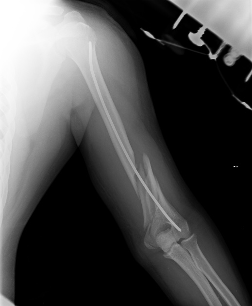 В данном случае, мне кажется наилучшим методом лечения ( если вообще, что либо предпринимать) является открытая операция : удаление IMN , эксплорация радиального нерва, резекция превдоартроза и фиксация 2 компрессионными пластинами .