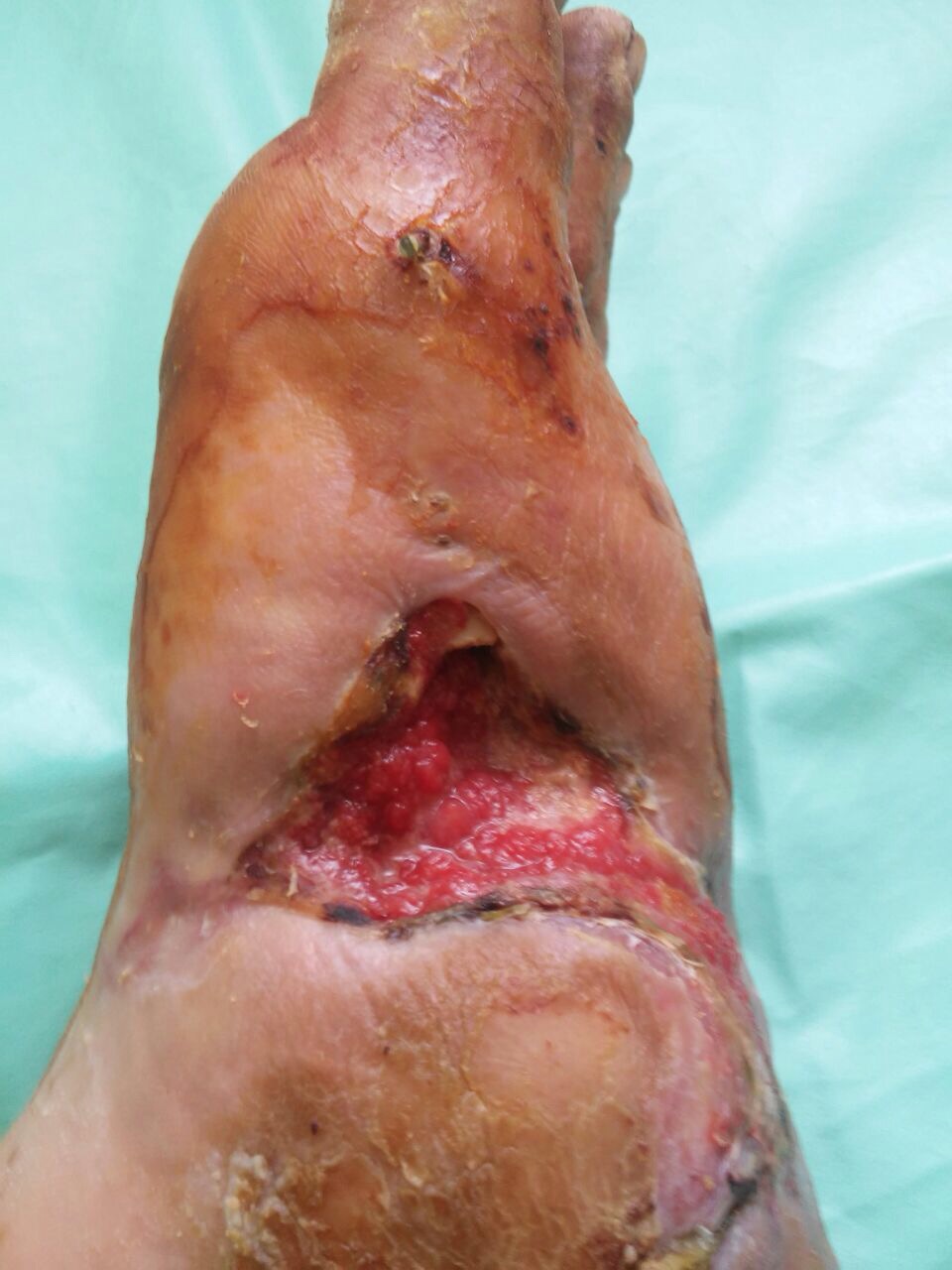 Возможно, пересечена одна из крупных артерий стопы. Все кости стопы смещены с укорочением. Очевиден дефицит кровотока в дистальных отделах. Наиболее оптимальный результат - филатовский стебель или другой васкуляризированный лоскут. После закрытия раны, решать проблему замещения (достаточно трудно).