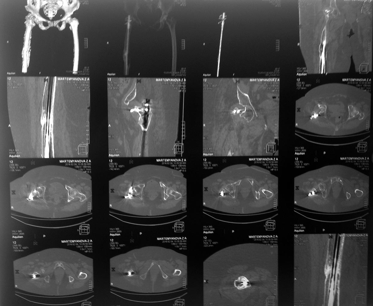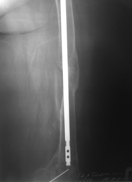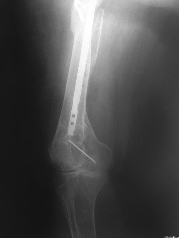 Что с коленным суставом? Судя по снимкам, можно предположить наличие гонартроза. Если это так, то абсолютно беспроигрышным вариантом представляется тотальное интрамедулярное замещение бедренной кости, гвоздь удаляется в эту же сессию. Имеем три в одном: искусственный тазобедренный сустав, искусственный коленный, риск перипротезного перелома исключён. Конечно вопрос бюджета