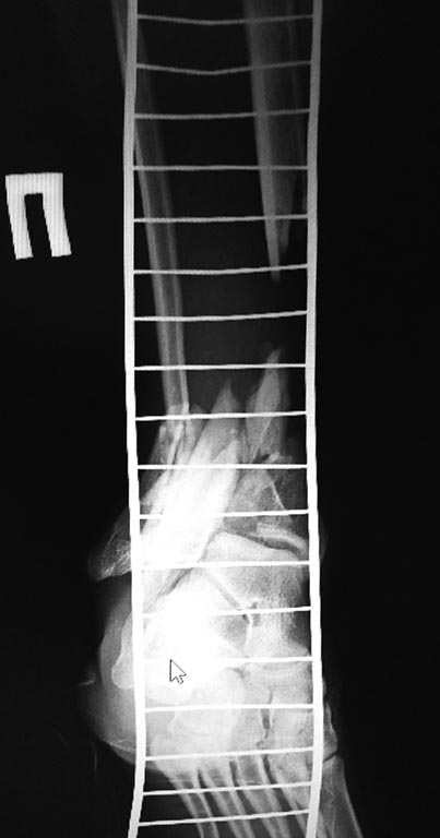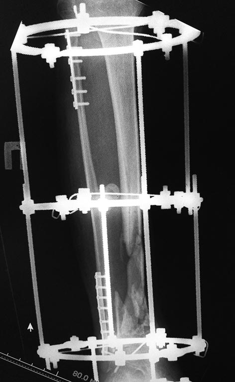 Добрый вечер уважаемые коллеги. Представляю Вам пациента 35 лет после кататравмы , которая случилась в декабре 2016 г. Длительное время лечился в стационаре, множество повреждений поэтапно было оперировано. Что касаемо голени, перелом был закрытый. Выполнена открытая адаптация отломков б/берцовой кости, комбинированный остеосинтез костей голени. Рана зажила первично. В настоящее время пациент передвигается самостоятельно при помощи костылей, и из всех повреждений, вопрос с голенью остался не решенный.