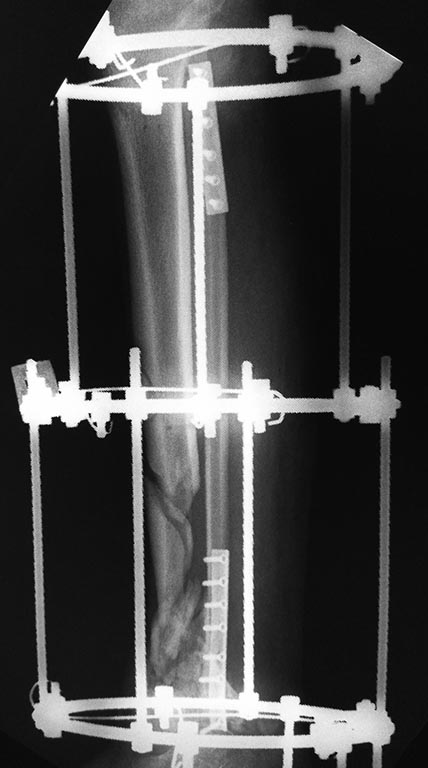 Представляю вам снимки первичные при поступлении и голень в аппарате на сегодняшний день. Тактическое предложение следующее: 1 вариант, учитывая скомпрометированную суставную поверхность б/берцовой кости, выполнить ретроградно штифтом артодез с фиксацией перелома б/берцовой кости. Выполнить рассверливание и открыто не вмешиваться. 2 вариант) микрохирурги предлагают открыться на место перелома б/берцовой кости, удалить нежизнеспособную кость и выполнить трансплантацию м/берцовой кости с другой голени , на сосудистой ножке. Предложите свой вариант возможного оперативного вмешательства. Буду очень признателен.