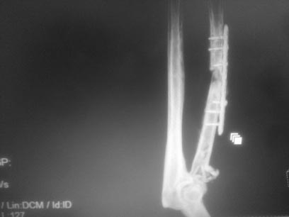 В настоящее время вновь обратился к нам в клинику со следующей клинической картиной: Локтевой сустав - дефицит разгибания 30 градусов, сгибания 20 градусов (не особенно беспокоит), отсутствие ротации предплечья(беспокоит), боли в лучезапястном суставе. При осмотре деформация предплечья, небольшая патологическая подвижность в с/3 предплечья, незначительное ограничение движений в лучезапястном суставе, но боли при движениях (преимущественно при девиации). На выполненом МСКТ (снимки отдельных сканов прилагаю) несращение диафиза лучевой кости, деформация оси 20 градусов (на первых снимках после операции ось нормальная), резорбция вокруг проксимальных винтов, значительные гетеротопические оссификаты вокруг головки лучевой кости, ее консолидация с небольшим смещением, неконгруэнтность в лучелоктевом сочленении. Планируемые варианты лечения: 1 Реостеосинтез диафиза лучевой кости пластиной с костной аутопластикой, после (в случае) консолидации перелома вторым этапом протезирование головки лучевой кости. 2 Одномоментно реостеосинтез диафиза лучевой кости пластиной без костной пластики и протезирование головки лучевой кости, с компенсацией длины лучевой кости за счет за счет протеза головки. Хотелось бы услышать Ваше мнение. Прошу прощения за излишнюю подробность.