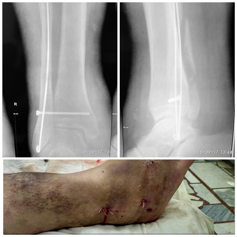 Ножка не фонтан, конечно. Вопрос. На фото дата 15.09. Это уже 10 дней однако. А что, вывих стопы не устранён но сих пор? Если да, то что остановило в ургентном порядке устранить вывих стопы, чрезкожно интрамедуллярно в малоберцевую пару спиц Киршнера (если стремно MIPO), задний край большеберцевой опять же чрезкожно винтом или хотя бы спицами, или не трогать, в крайнем случае, и позиционный винт опять же чрезкожно, и задняя лонгета?