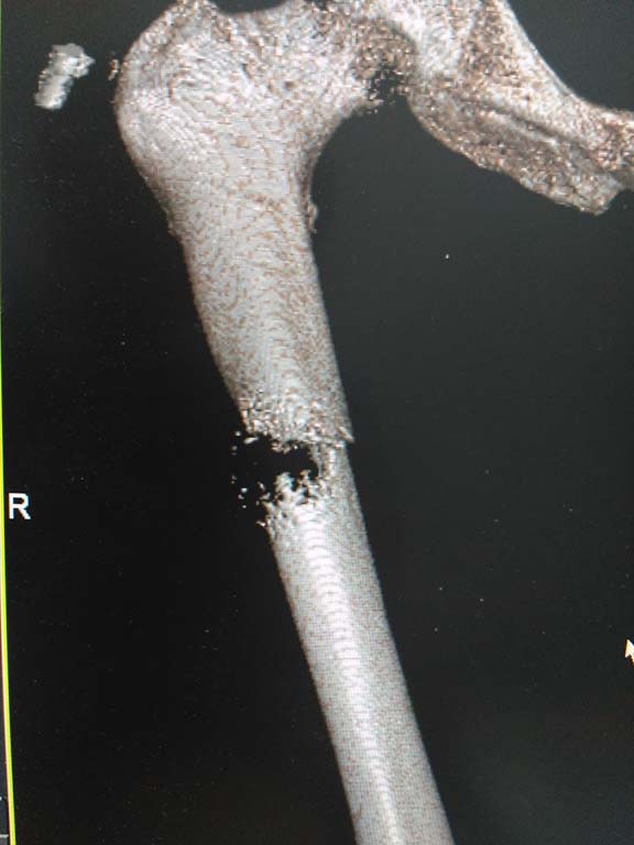 Меланома,саркома вообщем перелом на фоне метастаза. Закрытый интрамедулярный остеосинтез для активизации . Цитовскими развёртками закрыто сделать канал я думаю получится . Не забывайте про высокий риск тромбоза. после антирезорбтивная терапия. И ещё бы обычный снимок , с шейкой не понятно но, это вскорее просто реконструкция 3D.