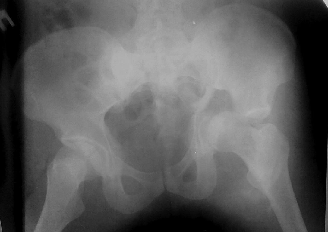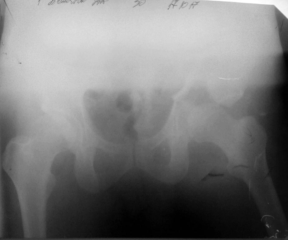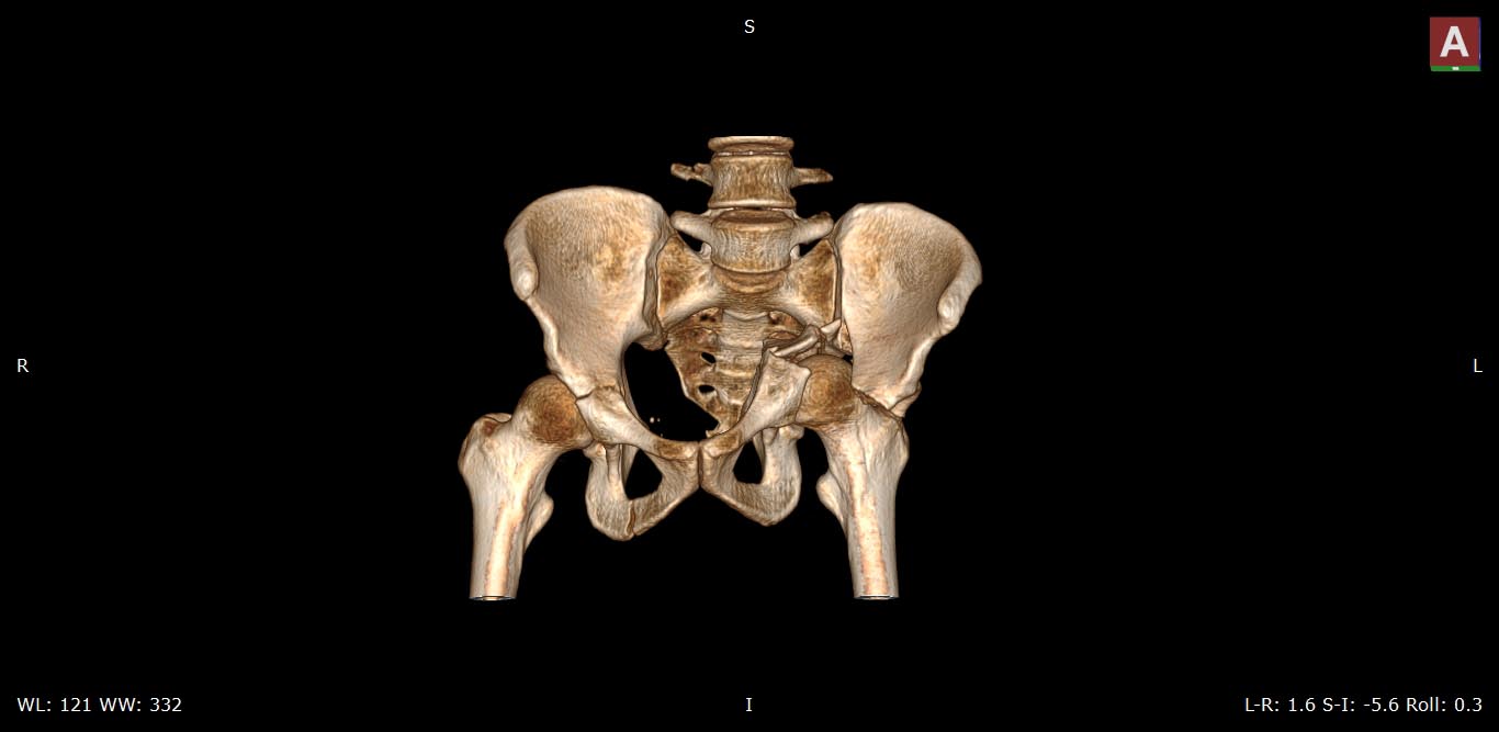 Добрый день, уважаемые коллеги! Данный случай-полифокальное повреждение таза.Самый неблагоприятный вариант поперечно ориентированного перелома вертлужной впадины и ротационно нестабильное повреждение тазового кольца (КПС). Оперативное лечение- открытая реконструкция сустава и перкутанная фиксация КПС.