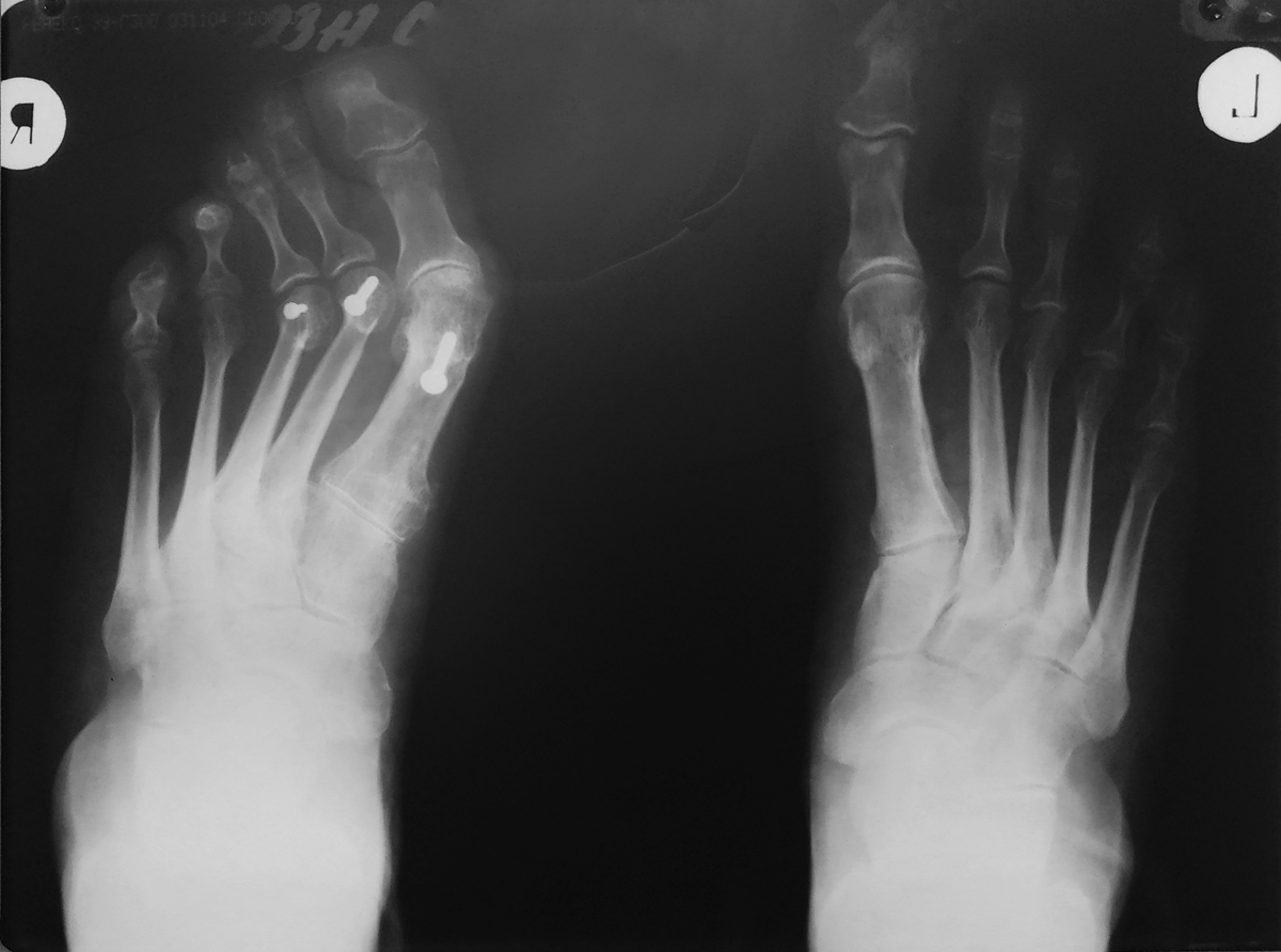Уважаемые Коллеги! Помогите определиться с тактикой лечения больной, которую уже четыре раза оперировали по поводу отклонения первого пальца кнаружи.