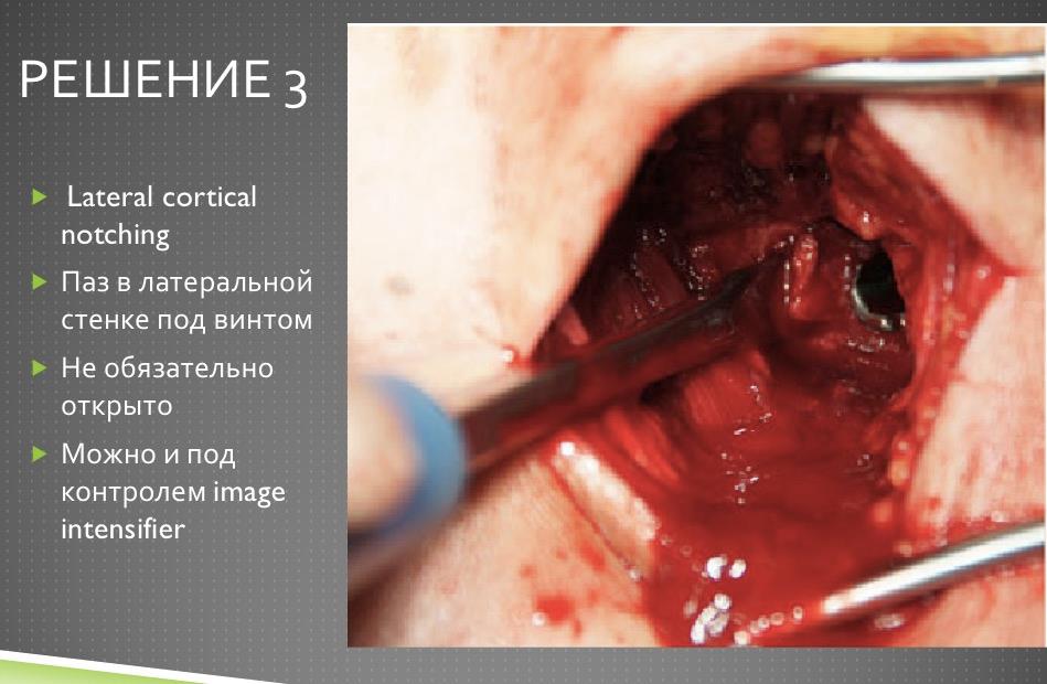Надо сделать дефект латерального кортекса высотой мм 10-15 шириной в этот винт прямо дистальнее винта, чтобы под ним была не стенка, а дырка. Удалить дистальные винты. И сколотить на столе. И либо оставить без винтов, либо динамический ввести, если есть сильные ожидания ротационной подвижности. Скорее всего, и он не нужен.