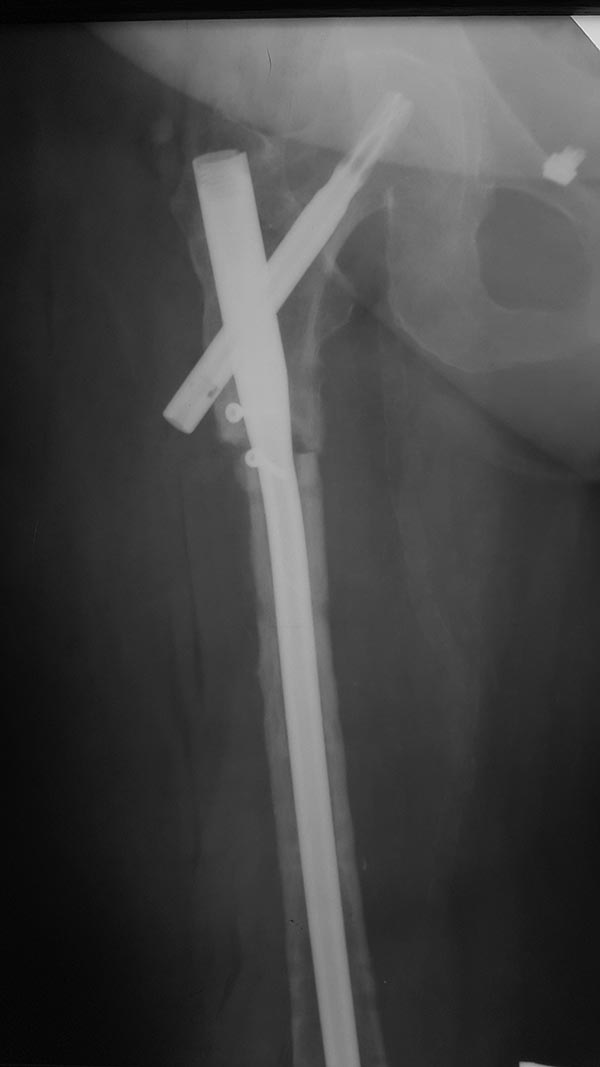 Операцию сделали, инфекции не выявлено, резецированы концы бедренной кости на 10 - 20 мм с каждой стороны, дистальный конец был нежизнеспособен, щели перелома выполнены губчатым аутотрансплантантом, также по передней поверхности фиксирован винтами губчато-кортикальный аутотрансплантант.