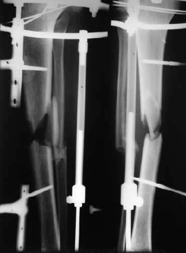 Величина резекции – это компромисс между желанием сделать её в пределах жизнеспособных тканей и возможными проблемами, связанными с укорочением. Выбор метода фиксации влияет на особенность техники резекции. При интрамедуллярном остеосинтезе, конечно же, нужна максимальная конгруэнтность (параллельность) контактирующих поверхностей. В идеале поперечный срез, в крайнем случае – немного косой. В данном случае большей пользой было бы немного укоротить проксимальный фрагмент, добившись строго поперечной резекции, чем использовать трансплантат. При фиксации аппаратом больше свободы для маневра, так как можно обеспечить плотный контакт даже в тех случаях, когда опилы костей не совсем параллельны. Пусть лучше срастется с угловым смещением, чем не срастется вообще. Резекция в подобных случаях при кажущейся незамысловатости, не является простой. При многолетнем анамнезе, десятках операций в этой зоне, пробираться приходится через сплошной рубец.