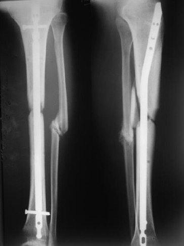 Коллеги, извините, текст вопроса разместился не полностью: фиксировать PFN либо PFNa с костной аутопластикой. Если интраоперационно возникнут сомнения в отсутствии инфекции либо положительная на наличие микробов интраоперационная микроскопия, интрамедулярный стержень предварительно покроем цементом с антибиотиками.