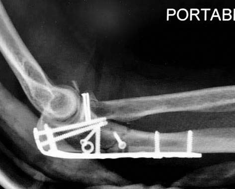 Для перелома локтевого отростка придуманы много пластин, надо выбрать по длине. А при краевых переломах головки ее окружность можно восстановить винтами 2 мм, но в данном случае имеется полный вывих головки и фиксация, даже специальной пластиной, может осложнится. Протез головки после удаления предупреждает нестабильность в суставе и деформацию оси конечности в будущем!