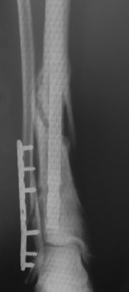 Молодой пациент 30 лет, 5 мес. назад прооперирован по поводу открытого перелома (2 ст) большеберцовой кости (стержень), малоберцовой кости (пластина). В течение указанного времени удален проксимальный статический винт, удален один дистальный винт в виду его миграции. Местные ткани - без проблем.