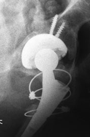 Информация недостаточная. Когда появились боли? Только через 5 лет или беспокоят все 5 лет? По поводу какой татологии выполнено эндопротезирование? Был ли инфекционные осложнения в послеоперационном периоде? Учитывая наличие винтов при фиксации чашки и серкляжной проволоки Предварительно можно сказать что были трудности во время операции, возможно раскол бедренной кости, что является предпосылкой для ранней нестабильности. Необходимо выполнить чёткие рентгенограммы тазобедренного сустава с захватом проксимальный 1/3 бедра (полностью ножка протеза) в прямой и аксиальной проекциях. Хорошо бы иметь в сравнении предыдущие рентгенограммы. Безусловно требуется клиническое обследование.