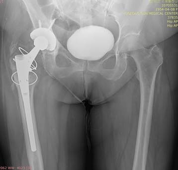 Спасибо всем, принявшим участие в обсуждении случая. Досылаю снимки сделанные две недели назад во время обследования у уролога. Более ранних снимков нет. По анамнезу – оперирована по поводу заболевания (диагноз не знает), травмы не было. На операции раскололи бедро, узнали об этом на следующий день и прооперировали повторно.