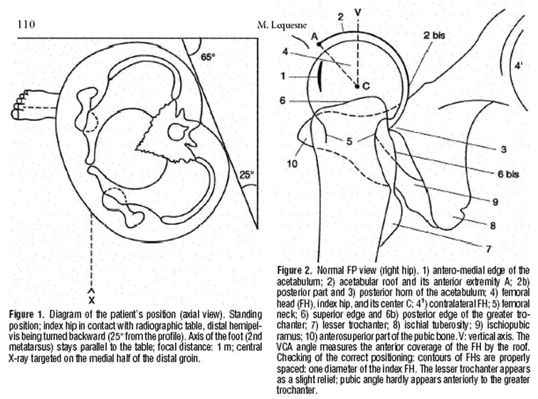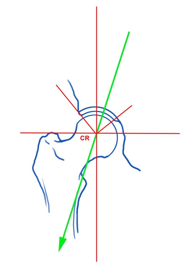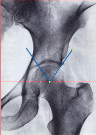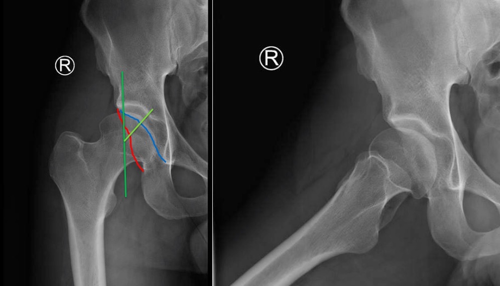 На представленном снимке (frog lateral) хорошо можно увидеть шейку и головку, но для данной патологии требуется false profile view! Для удобства приложил некоторые укладки: false profile и снимок с нормальными параметрами сустава (синими указаны центр край угол). Здесь имеется измененная и деформированная диспластическая форма головки, где огромный размер, выходя за пределы вертлужной впадины, создает иллюзию подвывиха. Очень узкая нагрузочная площадь и почти негативный (center-edge angle of Wiberg), потому что вертикаль (зеленая) от центра головки проходит с латеральной стороны. Контур передней стенки (синий) показывает что покрывает головку мало, а задняя стенка (красная) больших размеров доказывает что сустав развернут кпереди. Возможно за счет укладки, на рентгене слева шейка вроде короткая.