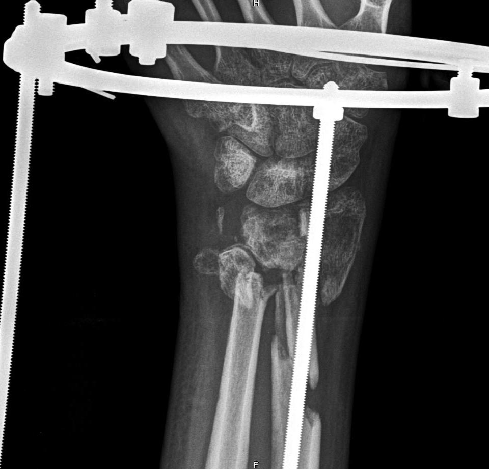 Отрытый многооскольчатый перелом ДЕМ обеих костей предплечья со смещением. < | >
