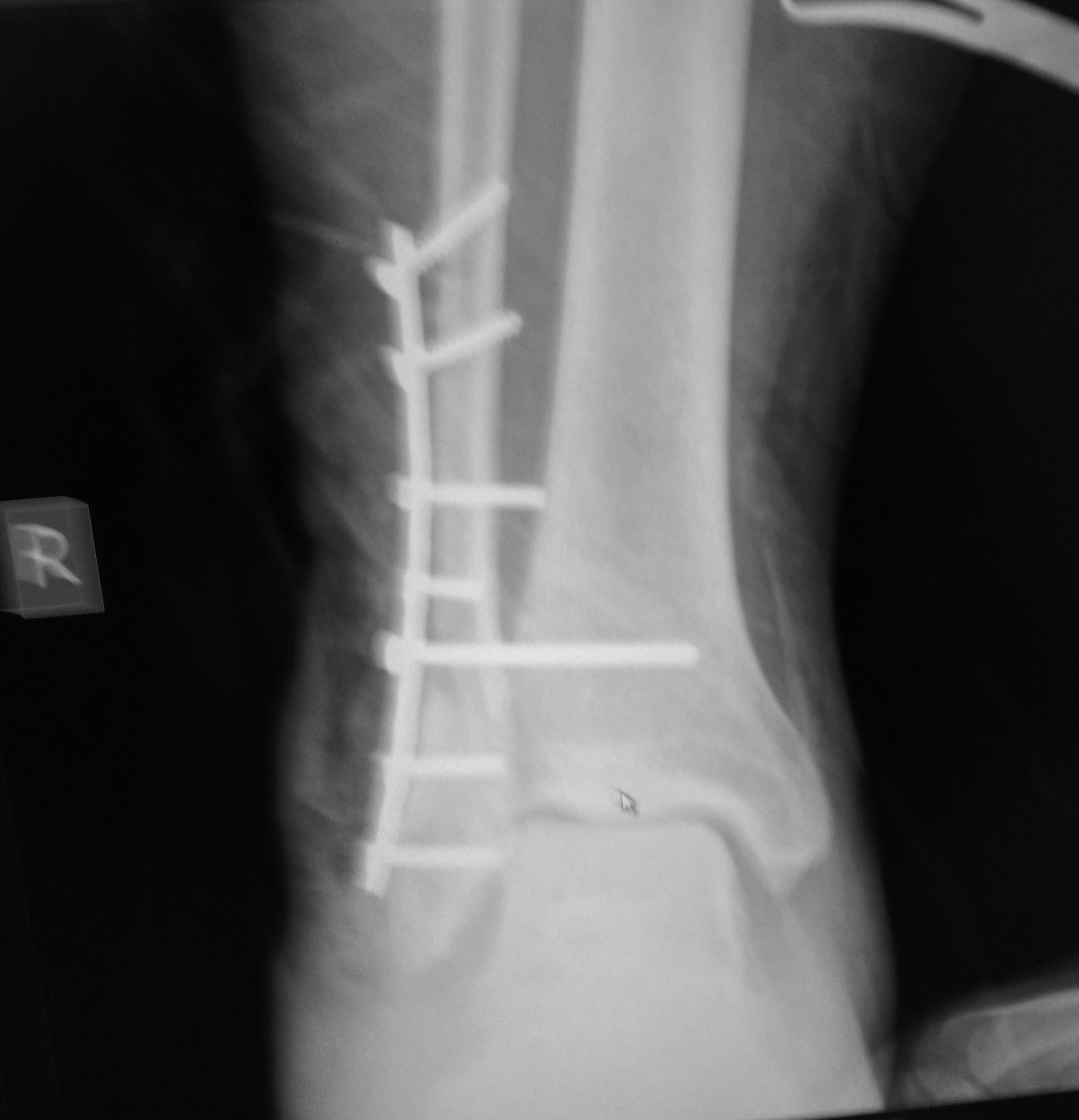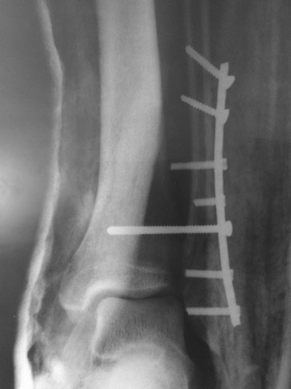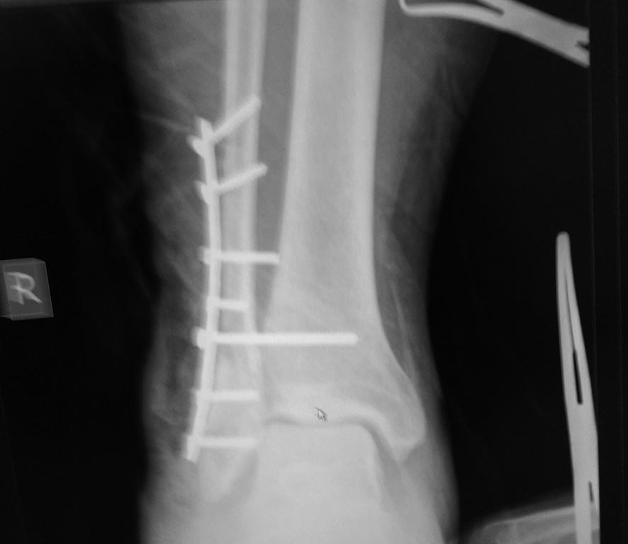Перелом надсиндесмозный. Лодыжка фиксирована все-таки 2 винтами. а вот синдесмозный винт вроде бы стоит уже в переломе и просто прижимает пластину к большеберцовой кости. на счет реостеосинтеза даже не знаю, но вроде бы послеоперационные снимки сделаны с небольшим вальгусом стопы. Есть ли снимки в нейтральной позиции стопы?