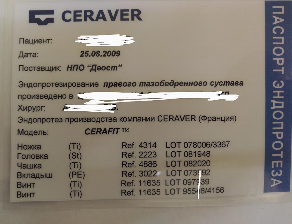 Протез фирмы Ceraver, модель Cerafit. О паре трения информации в документации нет, пациент сам не знает.